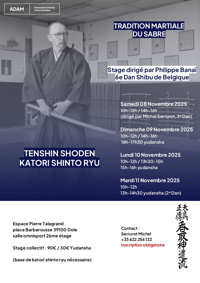 L’Association Doloise d’Arts Martiaux (ADAM) est heureuse de vous inviter à un stage intensif de Tenshin Shoden Katori Shinto Ryu du 8 au 11 novembre 2025 à Dole. Ce stage sera dirigé par Philippe Banaï, 6e Dan et Shibu de Belgique, offrant aux pratiquants une opportunité rare d’approfondir leur pratique de cet art martial ancestral sous la direction d’un expert reconnu.